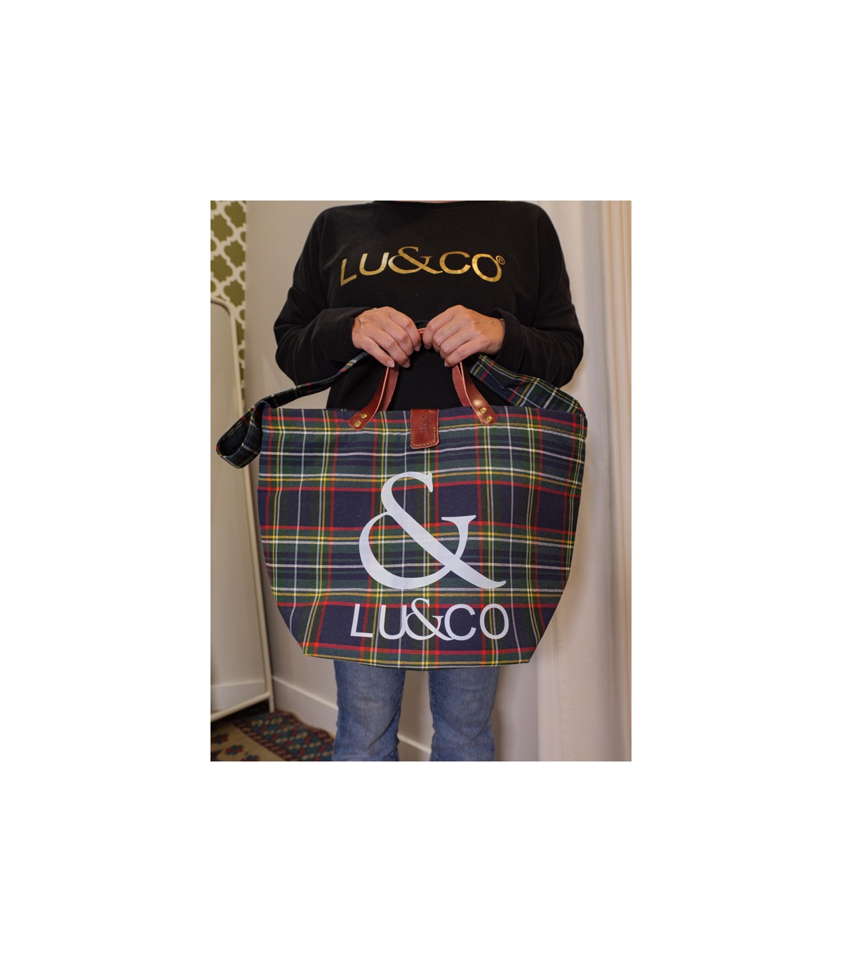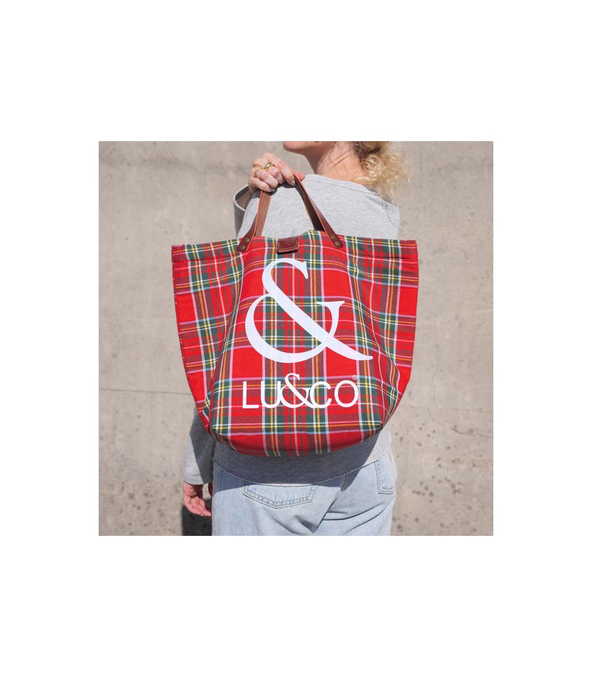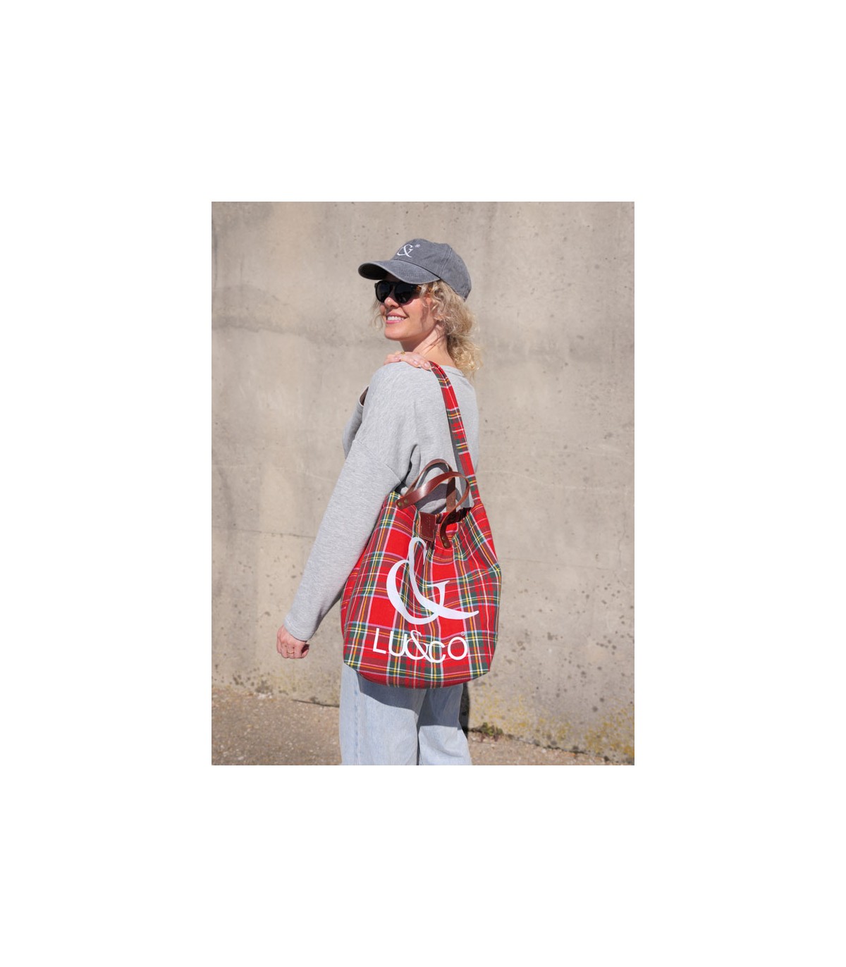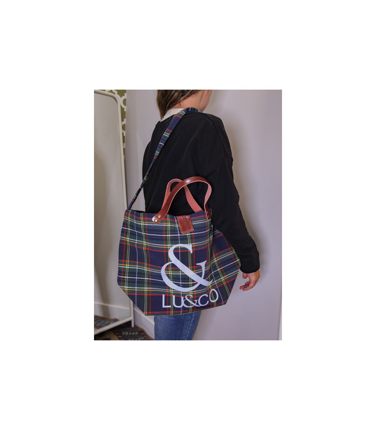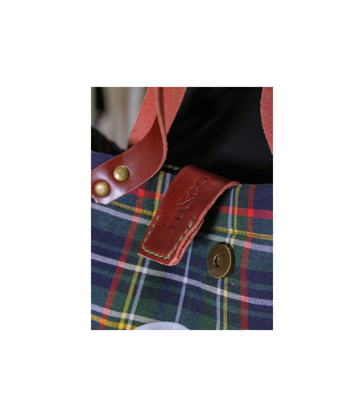 Bolso de fabricación 100% artesanal de tela con estampado tartán, cierre y correa corta en cuero genuino.
