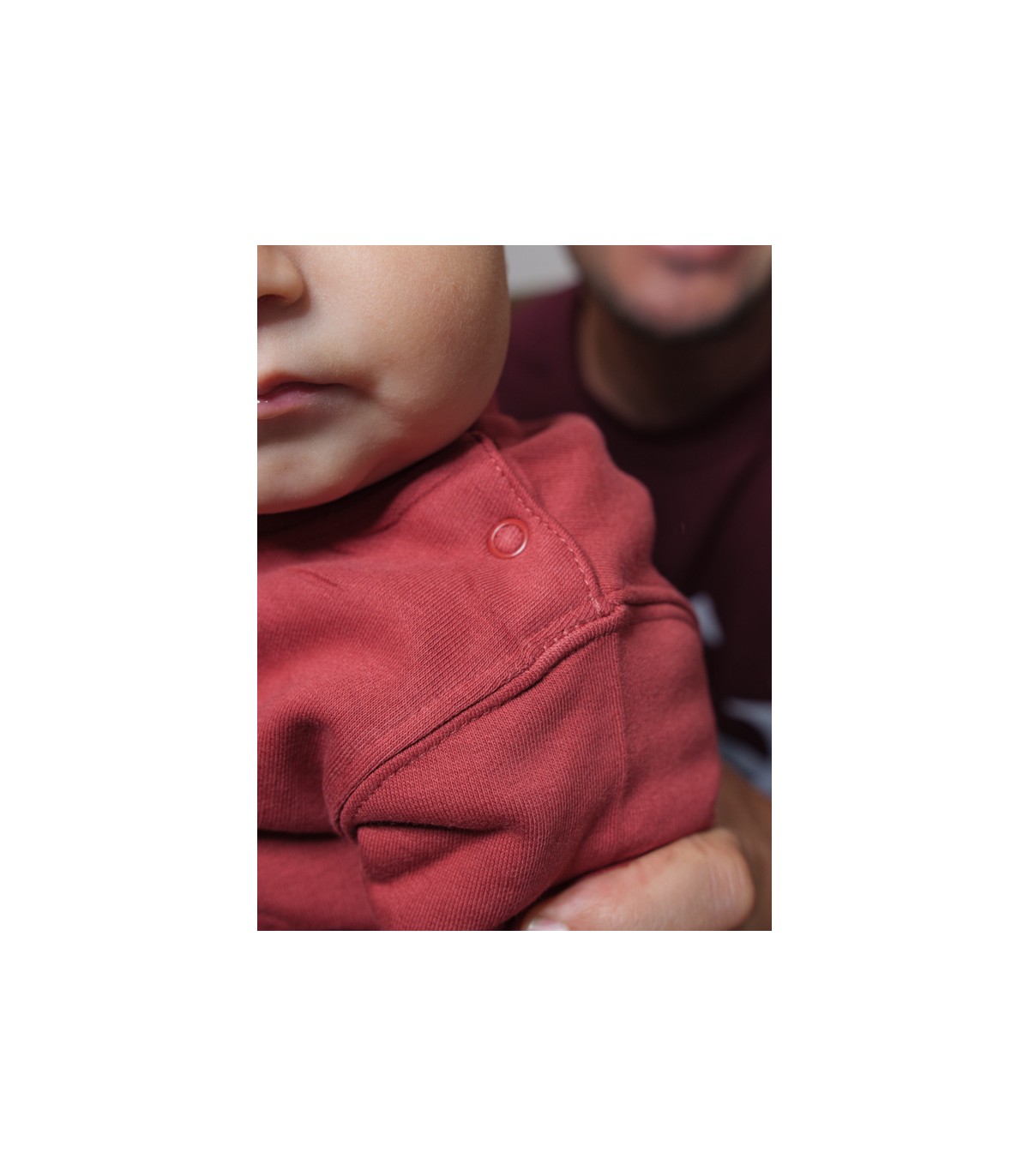 Sudadera de bebé de tacto suave (85% algodón orgánico / 15% poliéster reciclado), interior de felpa perchada, cierre en cuello para mejor colocación y logo estampado en vinilo.